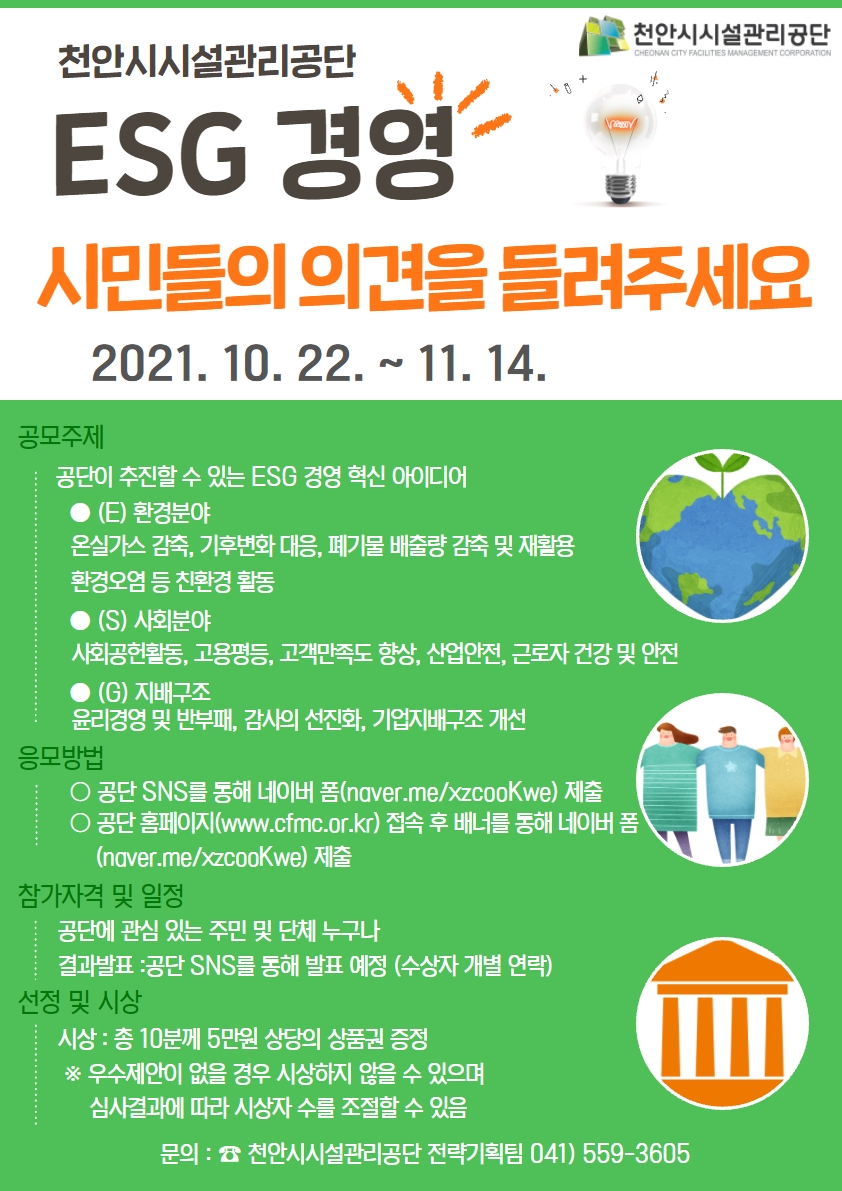 - [천안시시설관리공단] 2021년 천안시시설관리공단 ESG 경영 주민참여 아이디어 공모전 안내