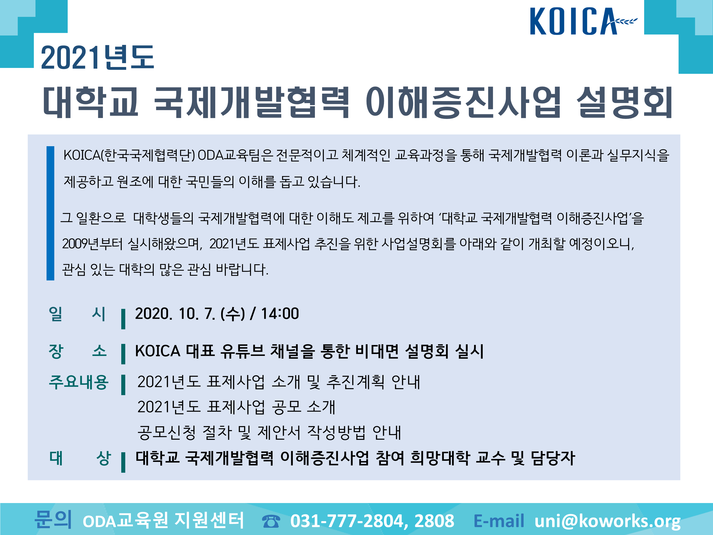 - [한국국제협력단] (KOICA) 2021년 대학교 국제개발협력 이해증진사업 공모 설명회 개최 안내 및 사업일정 안내