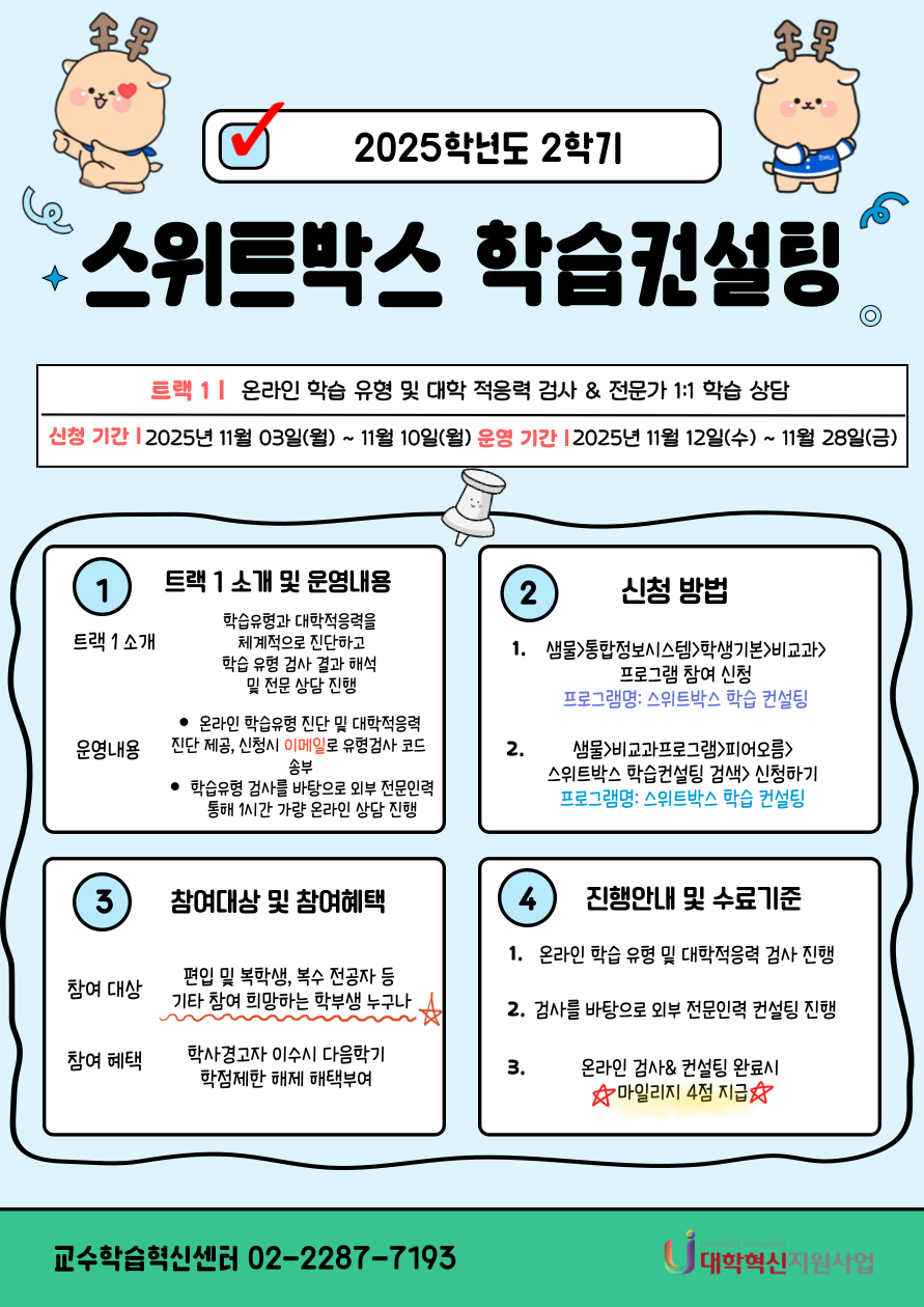 서울 [비교과] [교수학습혁신센터지원팀(서울)]2025학년도 2학기 스위트박스 학습컨설팅 모집 안내_트랙1 -